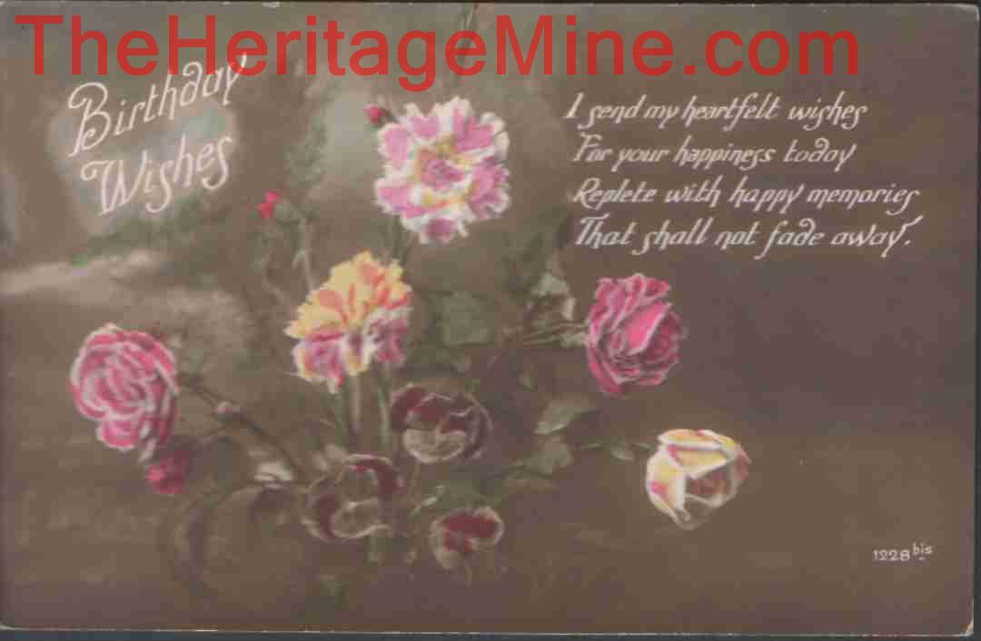 Birthday card, posted 28th January, 1917. 1901 census, 49 Norfolk Street, Norwich: Emma Ditcham 46, Florence Ditcham 16, born Norwich, Norfolk, England, Gertrude Ditcham 12, Isaac Henry Ditcham 48, Yarmouth, Norfolk, England.