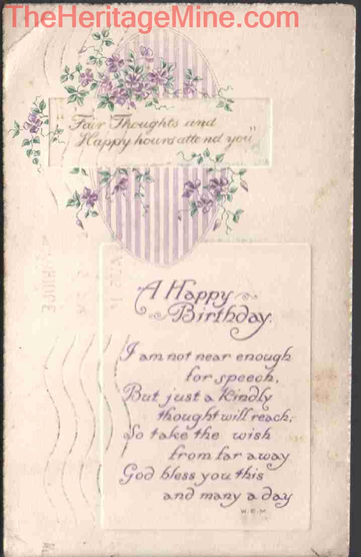 Birthday card, posted 24th August, 1915. 1901 census, Norwich workhouse: Clare Harvey 42 (married), Doris Harvey 9, Ethel Harvey 11, Horatio Harvey 5, Nellie Harvey 7. Contents may contain public sector information licensed under the UK Open Government Licence v3.0