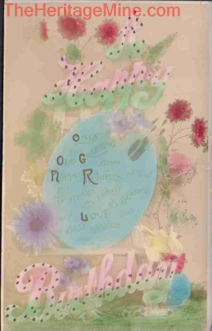 | Birthday card (posted 29 Nov 1907). Picture a little faded.