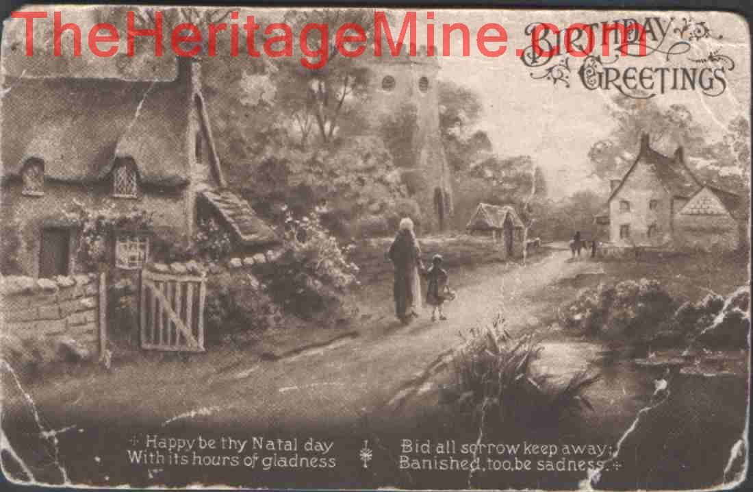 | Birthday card, posted 27 April 1927 (card in poor/creased condition). Card addressed to Harry (Tobacconist) and mentions 'Alice and the young ones'.