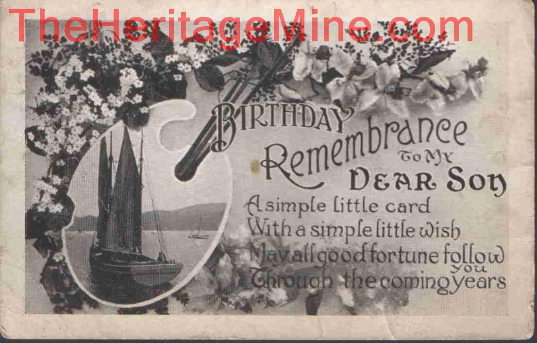 | Birthday card. Fragment of stamp carries 'H' for Halfpenny. This rate was increased to one penny in 1918.